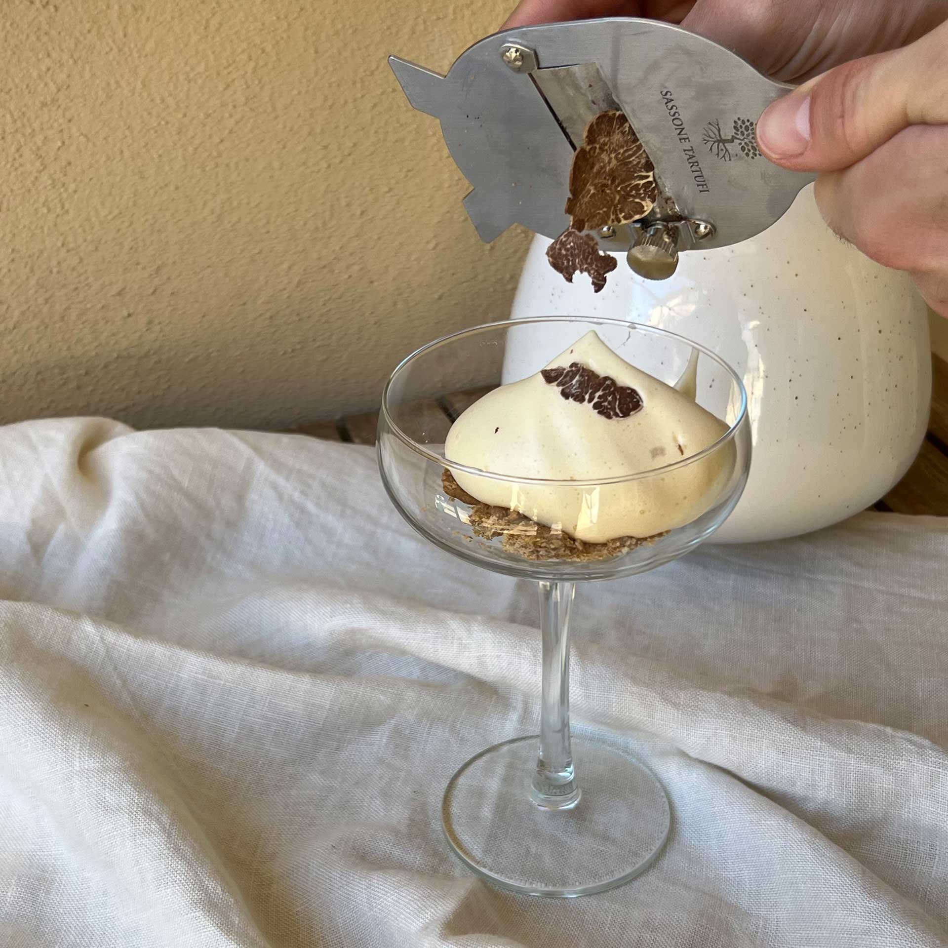 Nel fondo di una coppa sbriciolare dei biscotti e aggiungere la crema. Ultimare con del caffè in polvere e una grattugiata di tartufo bianchetto.