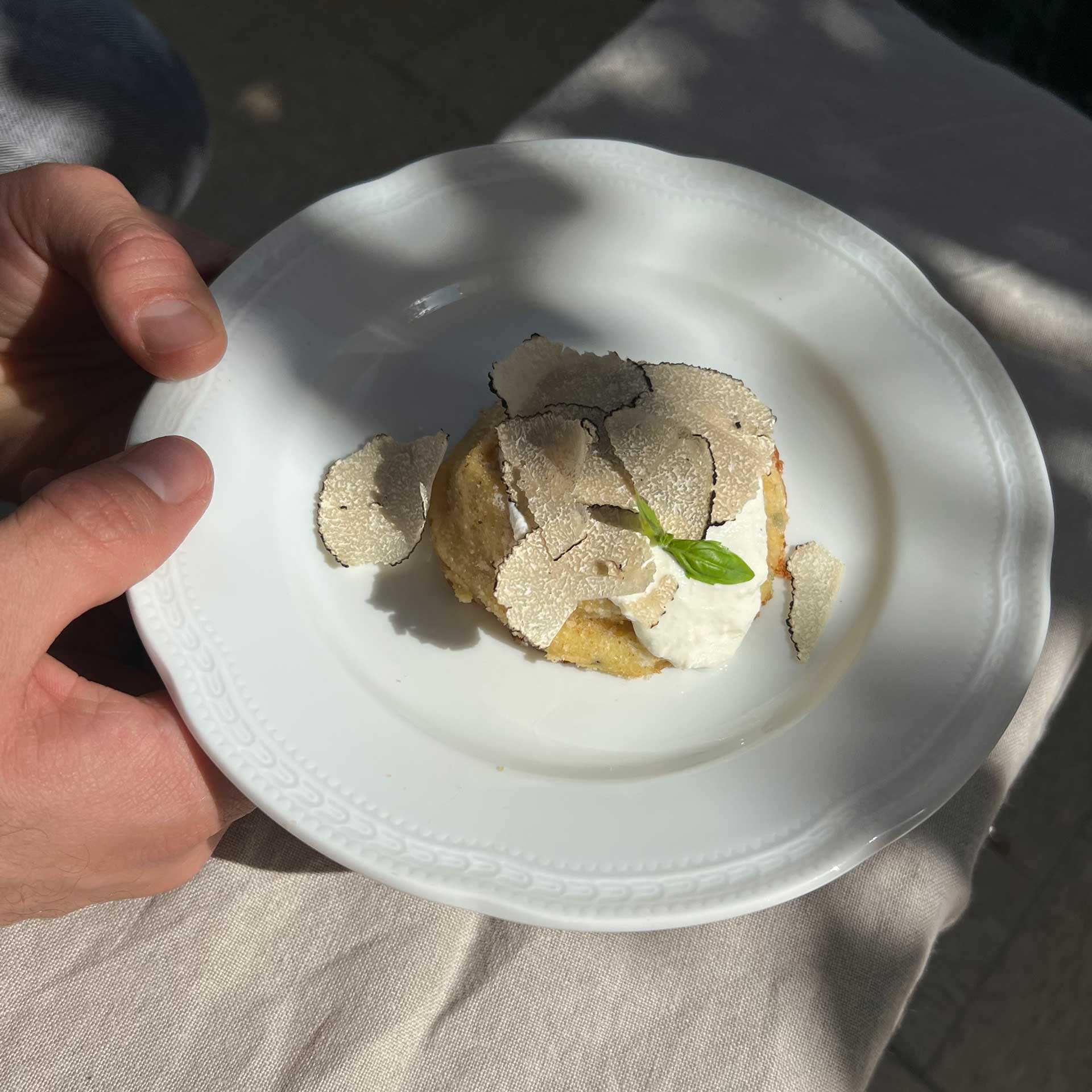 Finire il piatto con scaglie di tartufo scorzone.