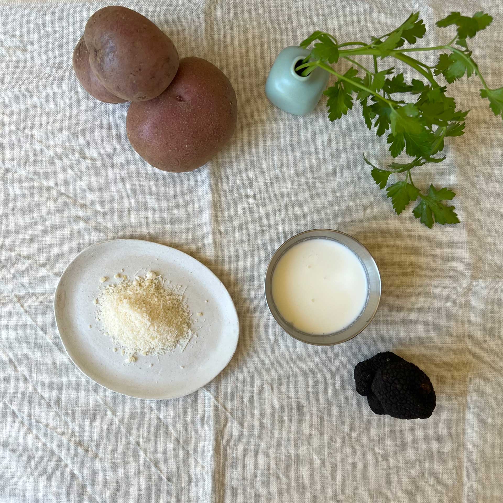 Lessare le patate, schiacciarle e unire olio, sale, parmigiano, pepe nero e un uovo.