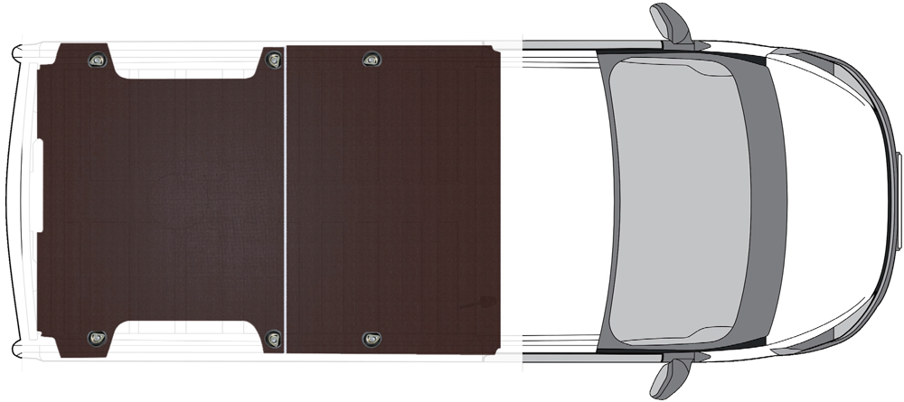 Il PIANALE in multistrato marino fenolico di betulla finlandese è tagliato e sagomato con pantografo CNC in rispetto delle forme specifiche del furgone sul quale andrà posizzionato; la parte superiore ha una superficie goffrata antiscivolo mentre la parte inferiore è liscia, entrambe hanno una protezione in resina.