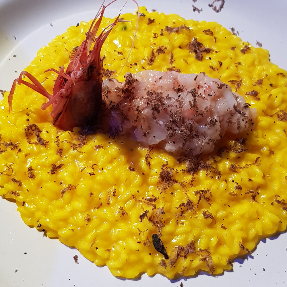 Risotto allo Zafferano con Tartare di Gambero e Tartufo Nero Pregiato