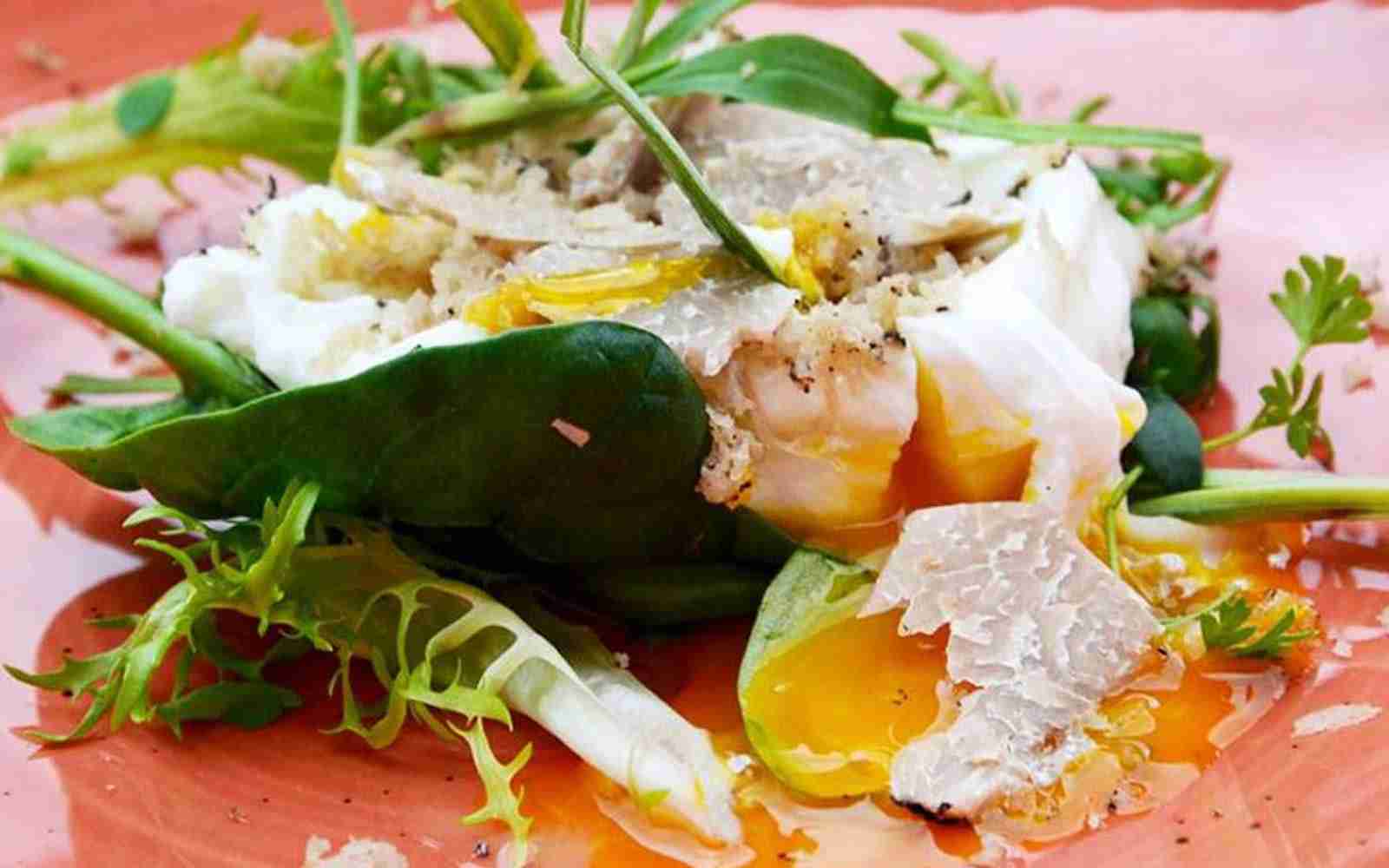 Successivamente impiattare con alla base le erbette del campo condite, del tartufo a scaglie e l’uovo, che dovrà risultare compatto fuori e morbido dentro.